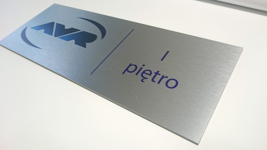Szyld i tabliczki informacyjne z nadrukowanym logotypem na podkładzie z płyty typu „dibond” srebrnej, szczotkowanej.