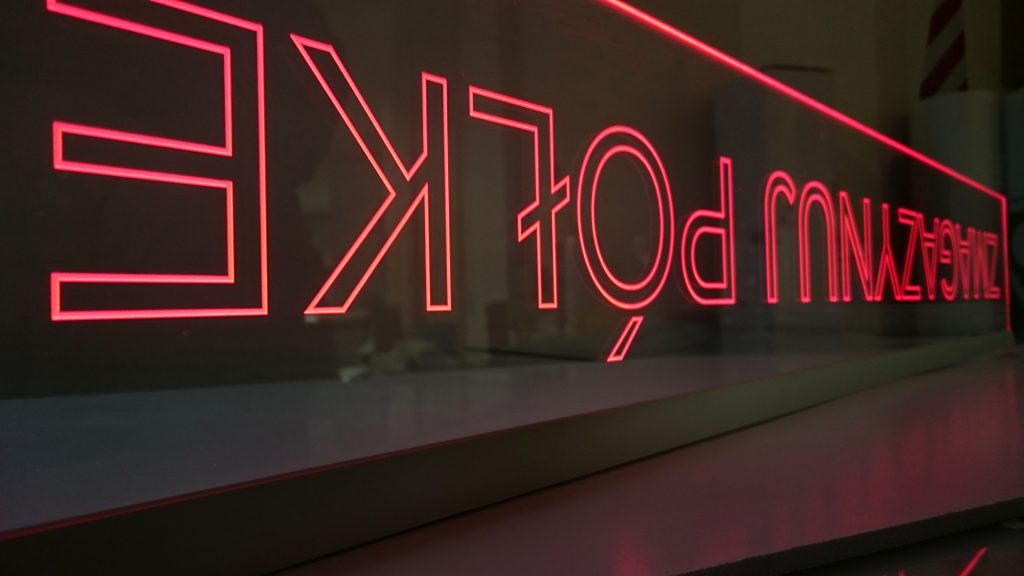 Prezenter z pleksi Przykładowe prace / ekspozytor, gięcie, grawerowanie laserowe, laserowe cięcie sklejki, prezenter, termoformowanie Prezenter pleksi z grawerem, szerokość 100 cm, podświetlenie LED.