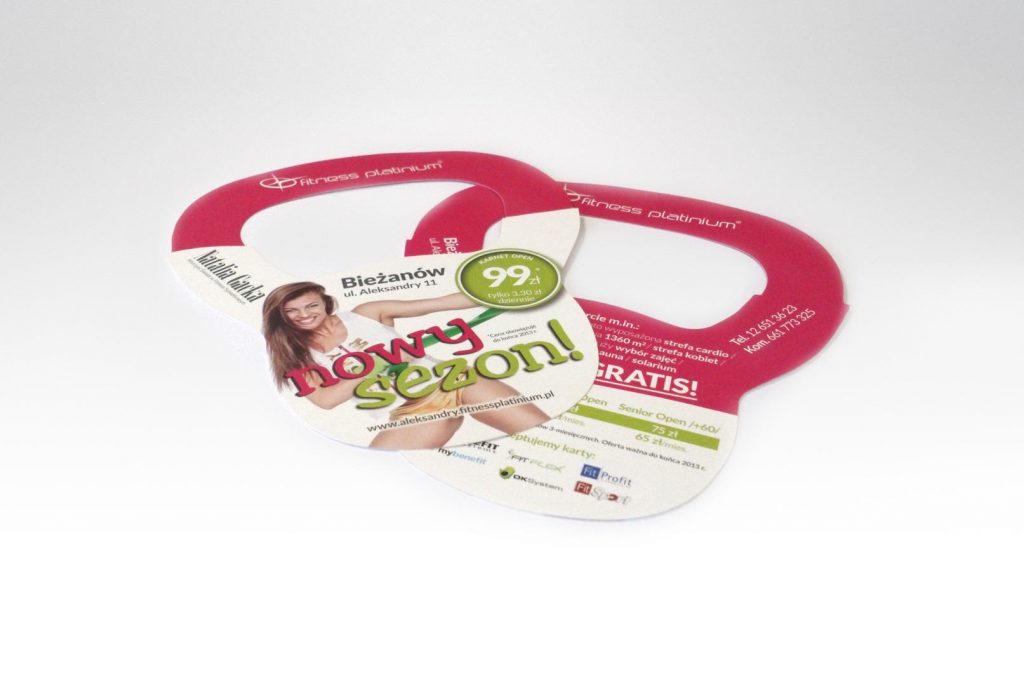 Zawieszki reklamowe na drzwi, wobblerPrzykładowe prace / By prografik Nietypowe zawieszki w kształcie hantla, druk i wykrawanie.
