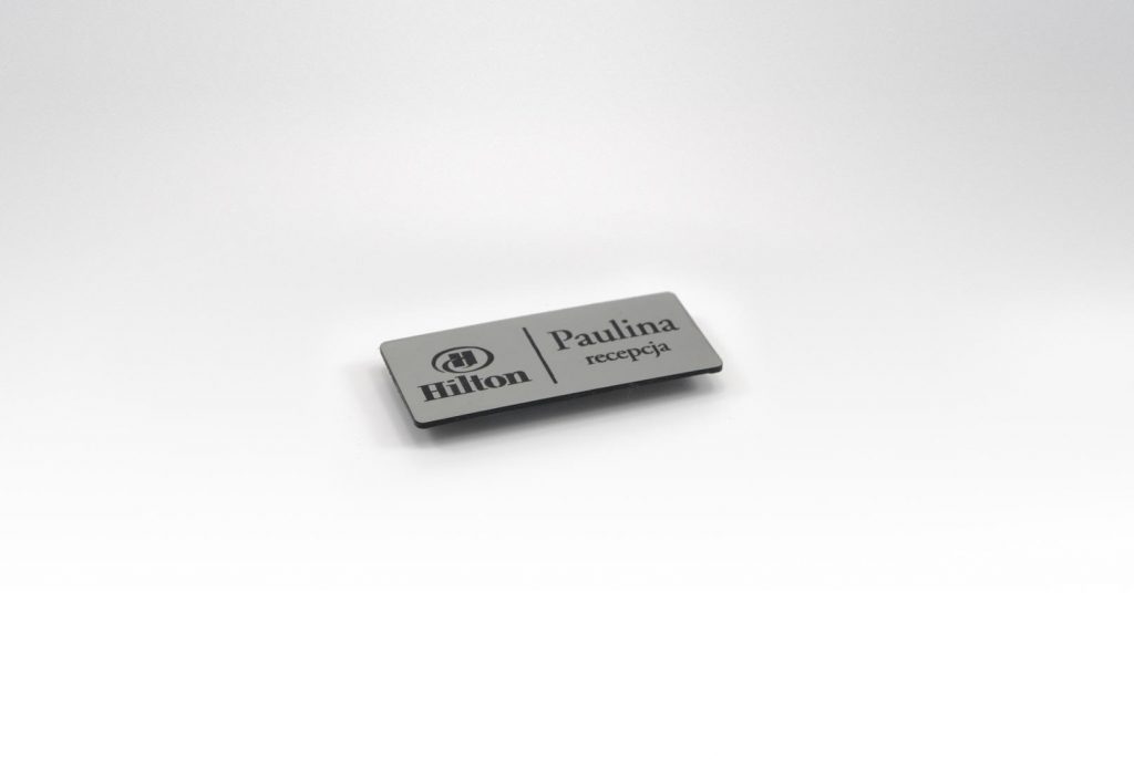 Identyfikatory grawerowane laserowo z mocną zapinką magnetyczną. Materiał: laminat grawerski srebrny lub złoty szczotkowany (dostępne inne kolory).