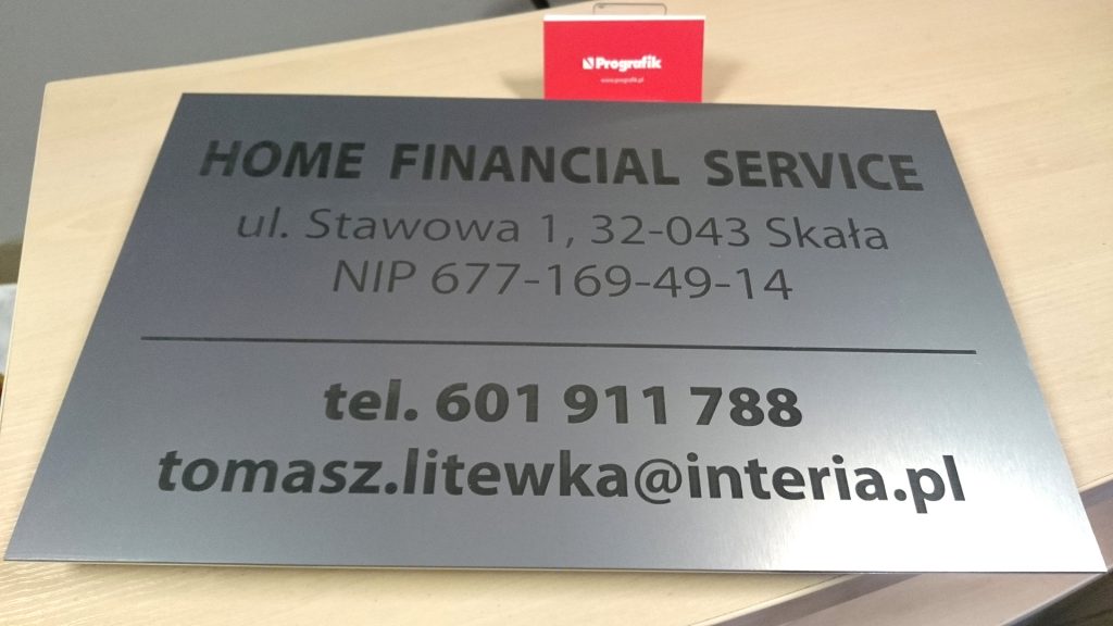 Szyld firmowy grawerowany laserowo na laminacie grawerskim srebrnym, szczotkowanym, od spodu dystans z czarnego pcw 5mm dla lepszej ekspozycji na murze.